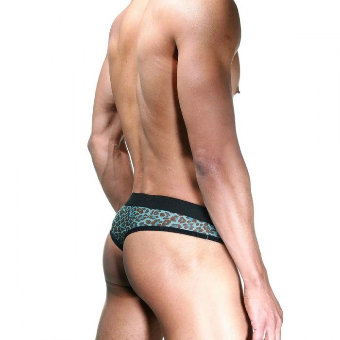 Мужские тонги из полупрозрачной ткани с расцветкой голубой леопард, с черным кантом и на широком черном поясе.
